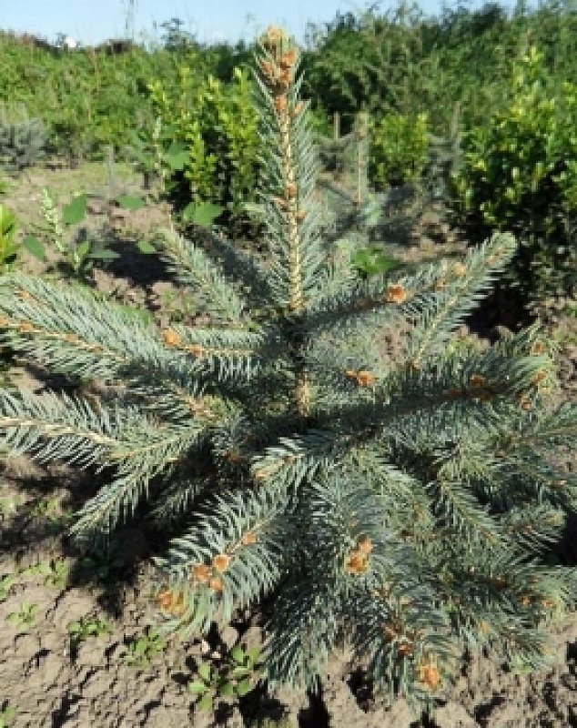 Иголки до 3 см длиной, цвет - голубой или сизый, благодаря восковому налету, который защищает их от мороза. Срок жизни хвоинок – 3-4 года, потом они опадают и на их месте вырастают новые. Молодые шишки красноватые, взрослые - коричневые длиной до 10 см и диаметром 2-4 см.