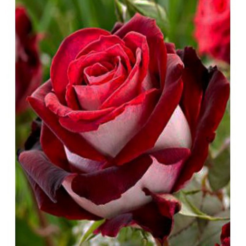 Цветы двухцветные - наружная сторона белая- внутренняя тёмно- красная, крупные 10см, густомахровые 65-70 леп., слабо-ароматный.