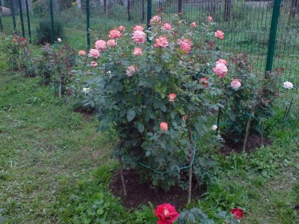 Очень ароматный сорт, но это с лихвой компенсируется высоким контрастом и сочетанием цветов бутона. Кусты сильнорослые, прямостоячие, высотой до 100-120 см, листья крупные блестящие, обладают высокой устойчивостью к болезням, впечатляют крупные махровые цветы диаметром до 13 см.Отличная зимостойкость сорта.