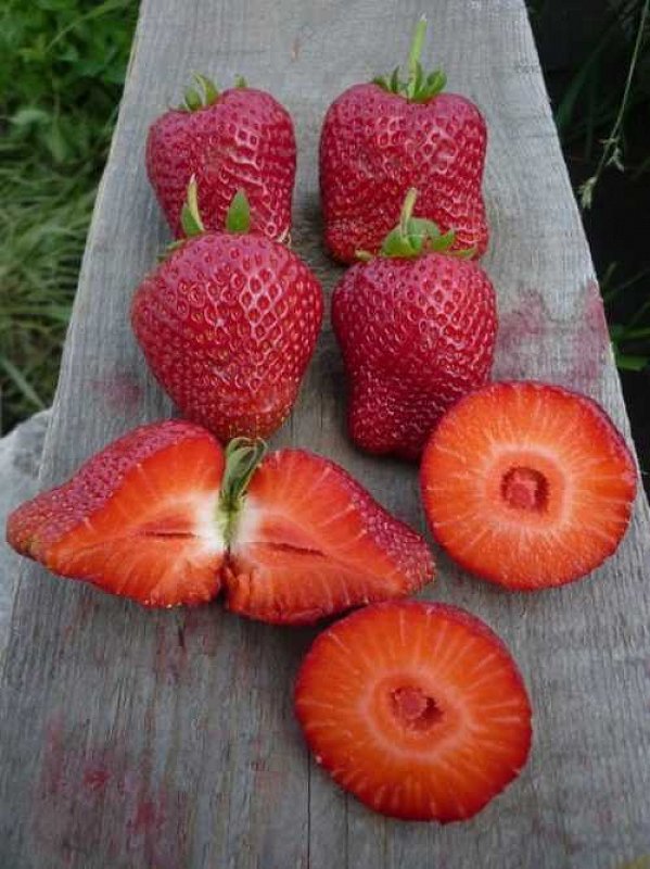 Ягоды крупные в средней массе 25-40 г и очень крупные - первый сбор до 70 г. Мякоть красная, плотная, умерено-сочная, пустоты внутри небольшие, вкус сладкий с достойным ароматом, приятный. Форма плодов яйцевидная (коническая либо в виде усеченного конуса).