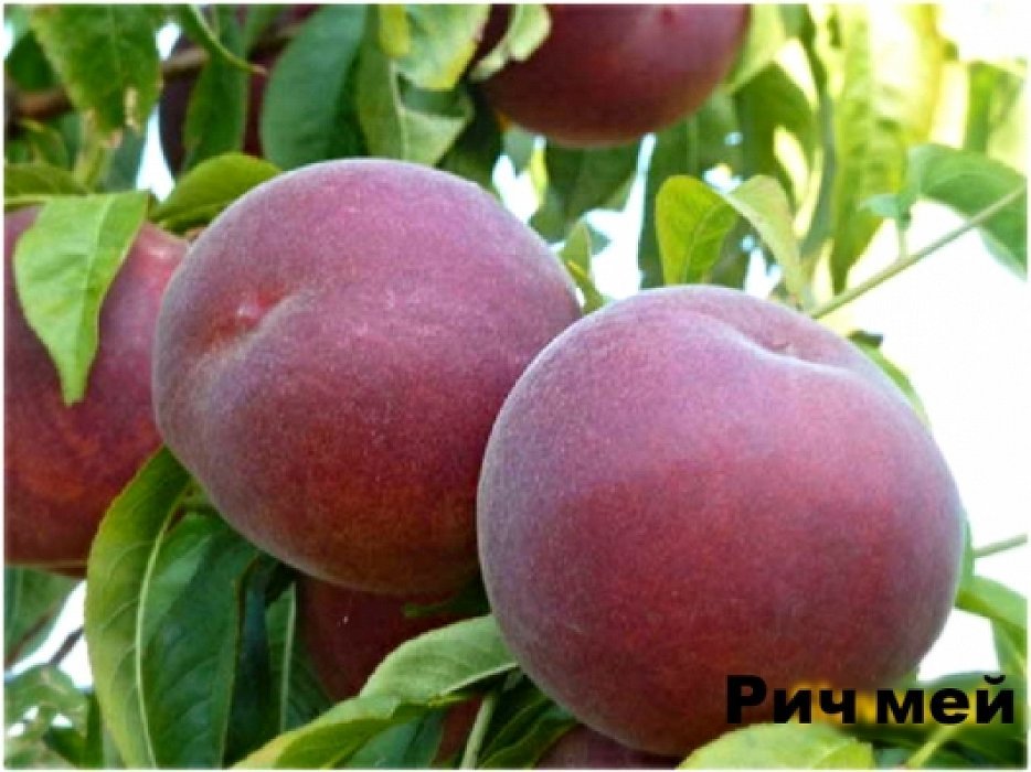Персик Рич Мей /Rich May/ - ранний сорт персика. Селекция Флойд Зайгер, США. Созревание в 20 числах июня (-30 от Rh). Плоды очень крупные, средней массой 230 г, форма плодов - шаровидная, румянец на 90-100 % красного цвета.