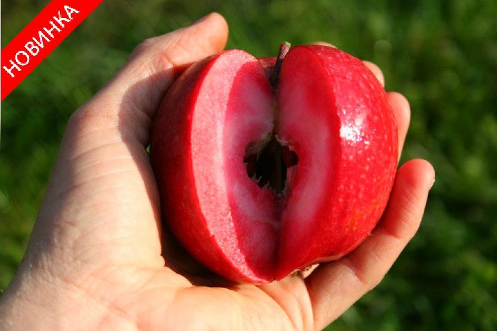 Цветет темно-малиновым цветом. Листья с красным отливом. Плоды средних и крупных размеров, массой 150 - 180 г, тёмно-красного цвета, мякоть насыщенно красного цвета, вкусная, сладкая, немного с кислинкой, отличных вкусовых качеств. Насыщенный цвет сока сохраняется при стерилизации.